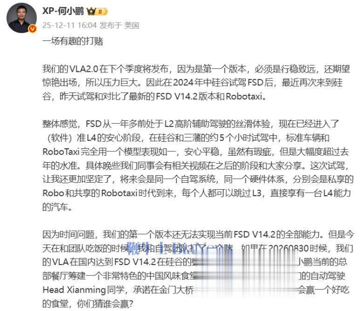 他说:“因为时间问题,我们的第一个版本还无法实现当前FSDV14.2的全部能力。但是今天在和团队吃饭的时候,我和自驾团队打了一个赌。如果在20260830时候,我们的VLA在国内达到FSDV14.2在硅谷的整体效果,我会在硅谷参考小鹏当前的总部餐厅筹建一个非常特色的中国风味食堂;反之无法实现的话,我们的自动驾驶HeadXianming同学,承诺在金门大桥裸跑。我们团队都相信他们会赢一个好吃的食堂,你们猜谁会赢?”(转载自:电车界)